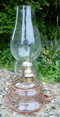 Vintage Pink Glass Oil Lamp with Carrying Handle, Chimney & Single Brass Burner.