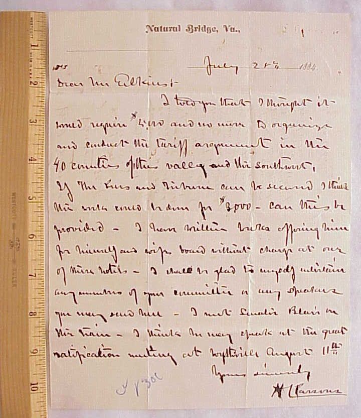 Title (ebay affiliate link): Natural Bridge VA 1884 Blaine Logan Campaign Letter Railroad Baron H.C. Parsons