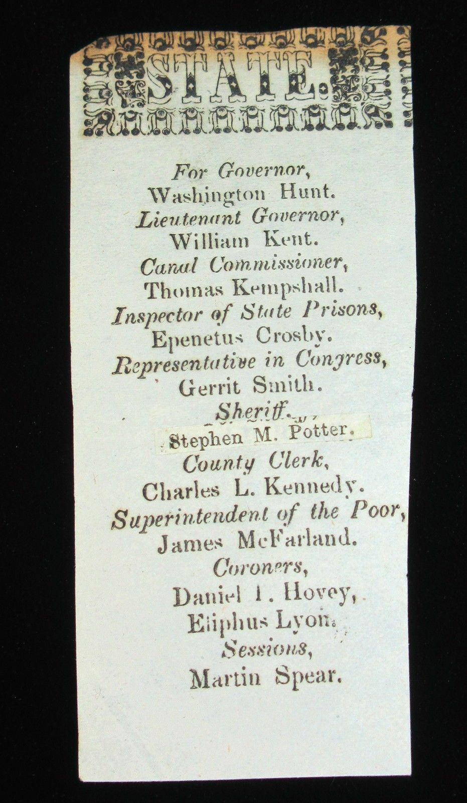 ELECTION TICKET 1850 NEW YORK STATE Washington Hunt WHIG Gerrit Smith Politics