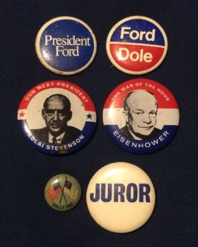 Title (ebay affiliate link): Lot of 6 Vintage Assorted Tin Litho Juror Rally Day and Campaign Buttons Pins