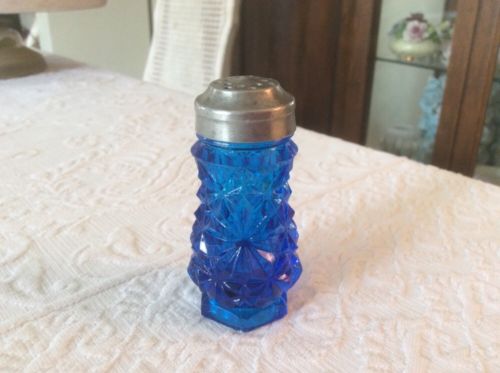 Title (ebay affiliate link): ANTIQUE VINTAGE BUTTONS & BOWS COBALT BLUE EAPG PRESSED GLASS SHAKER 3"