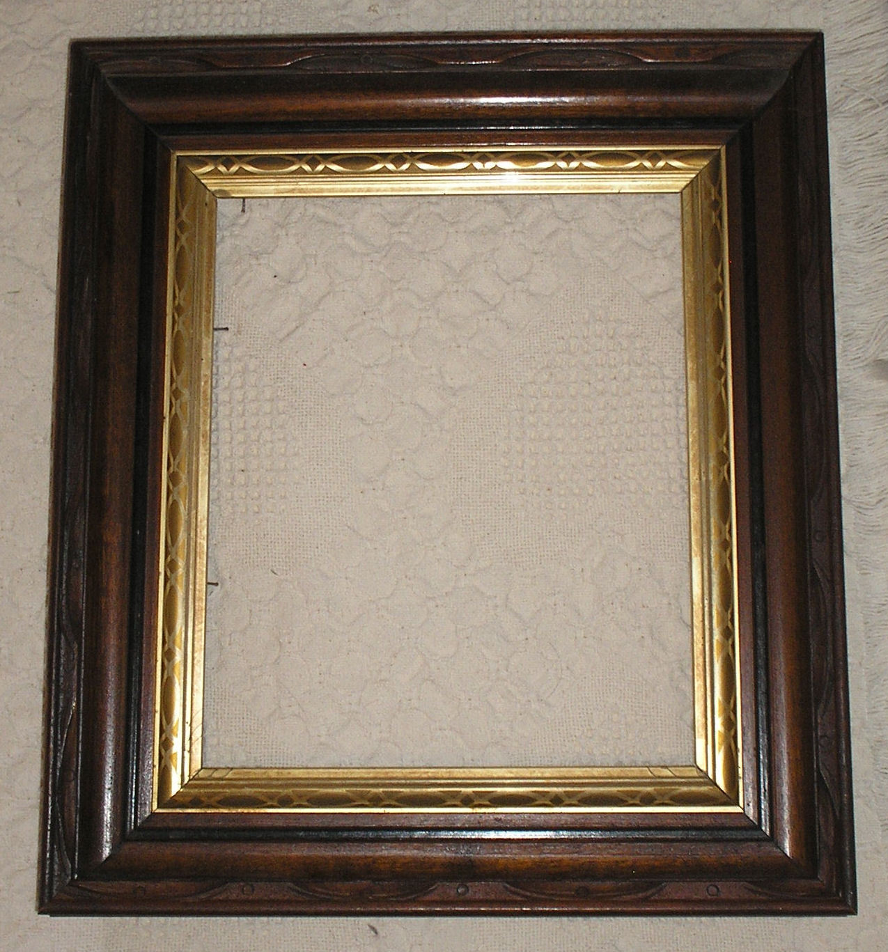 Title (ebay affiliate link): ANTIQUE EASTLAKE DEEP WELL WALNUT PICTURE FRAME WITH ORNATE GOLD LINER 15"X17"