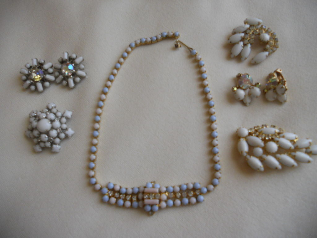 Title (ebay affiliate link): Vintage WHITE PINK BLUE MILK GLASS AB RHINESTONE JEWELRY LOT 6pcs WEISS
