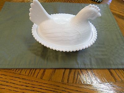 Vintage White Milk Glass Hen Chicken on Nest Basket Candy Dish 5"t x 7"l