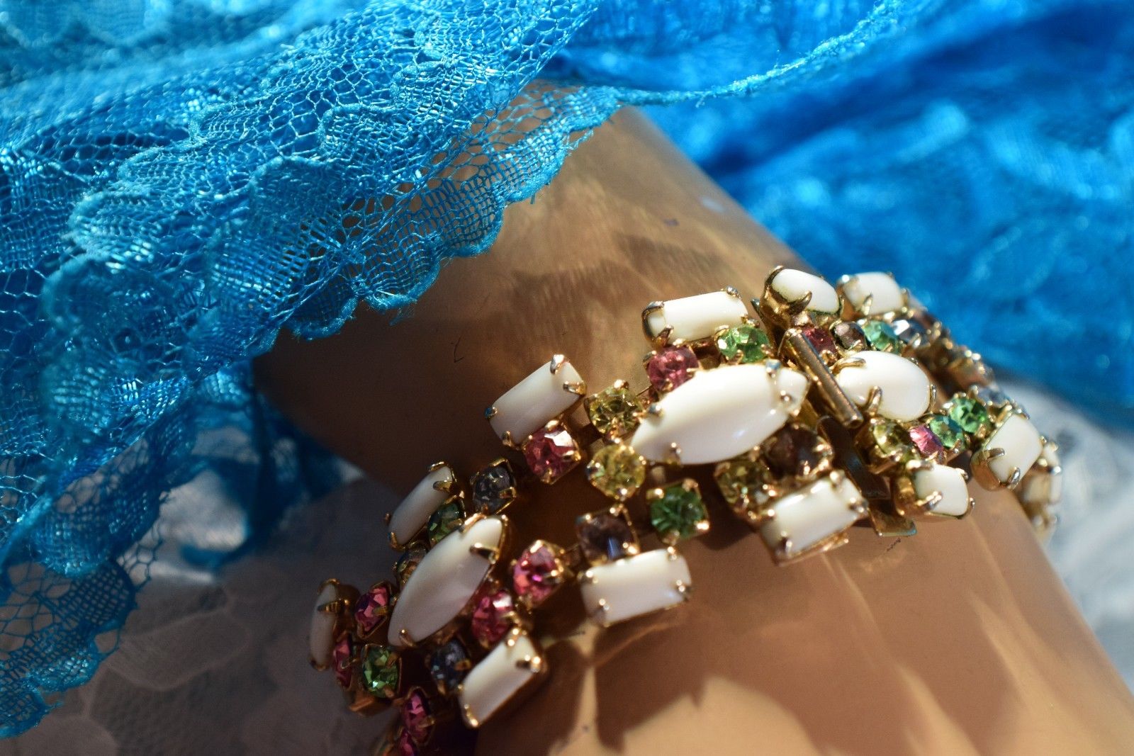 Title (ebay affiliate link): VINTAGE ESTATE MILK GLASS w/ PERIDOT &PINK RHINESTONES GOLDTONE BRACELET LOT#380