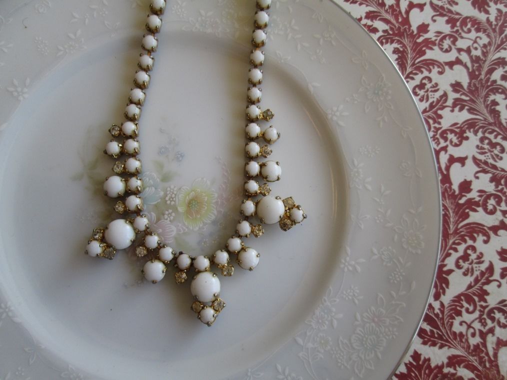 Title (ebay affiliate link): Vintage Estate White Milk Glass & Clear Rhinestone Necklace, Antiqued Gold Tone