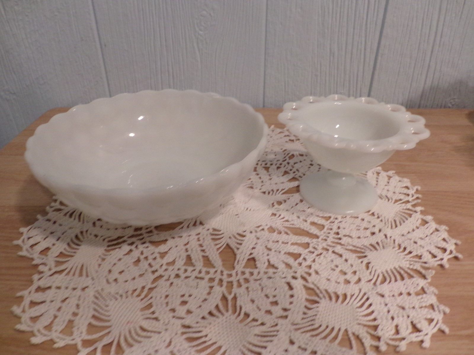 Title (ebay affiliate link): 2 White Milk Glass Items Large Bowl and Small pedestool bowl