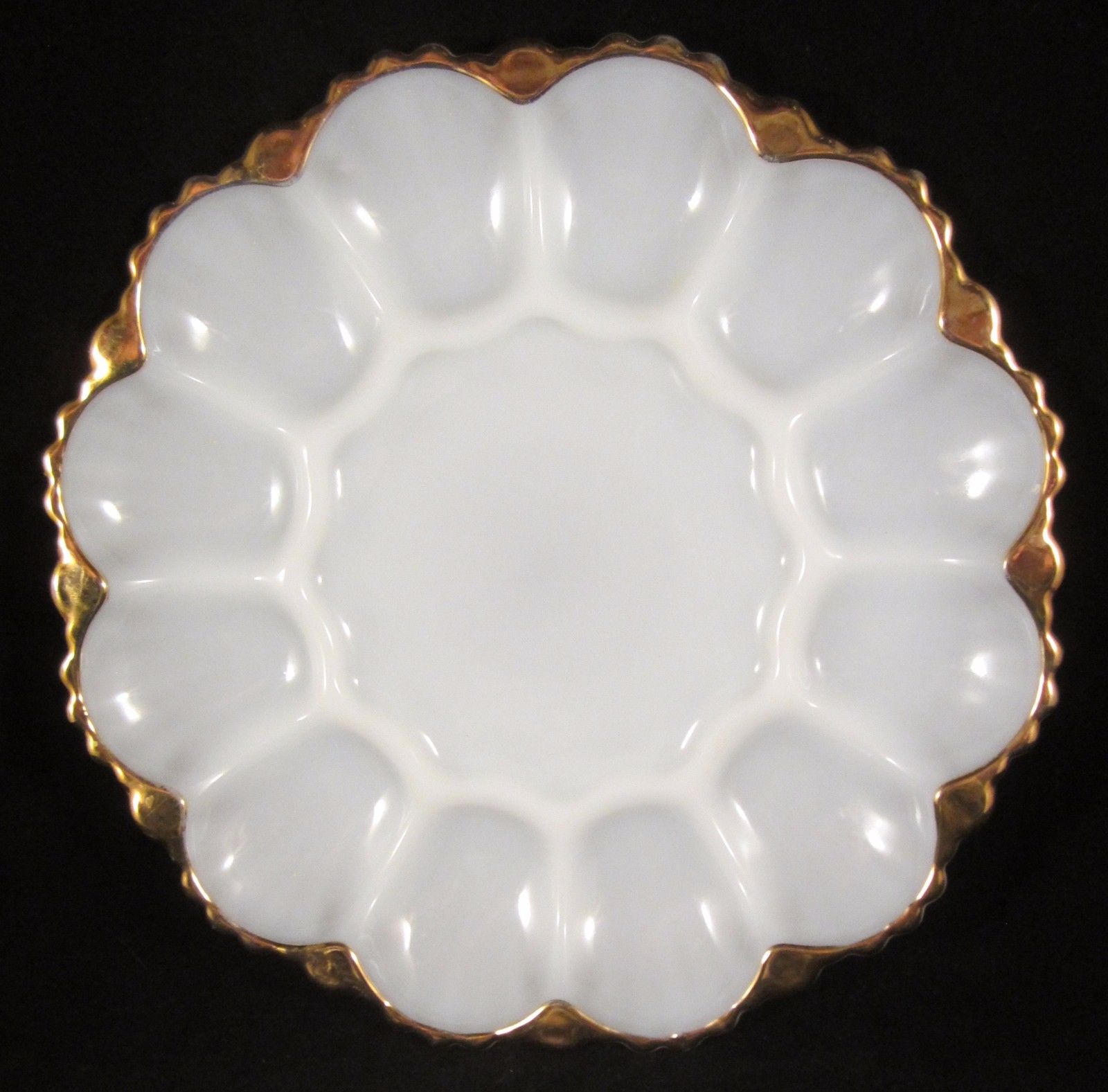 Vintage Anchor Hocking Fire-King Milk Glass Deviled Egg Plate 22K Gold Trim Mint