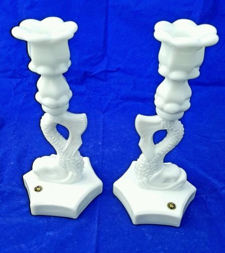 Title (ebay affiliate link): 2 Vintage WESTMORELAND MILK GLASS Dolphin Koi Fish Candle Holders 10" Asian Fish