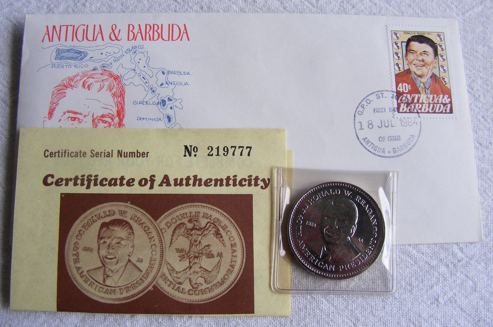 Title (ebay affiliate link): Ronald Reagan 40th Double Eagle Commemorative Coin & 1st Day Issue Stamp Envelop