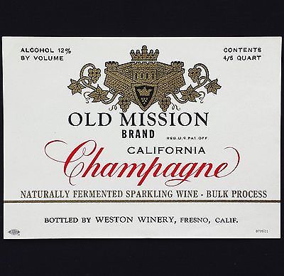 Old Mission California Champagne Vintage Old Label Weston Winery Fresno CA USA