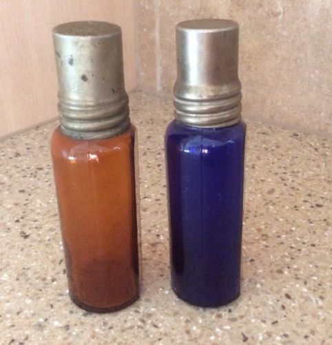 Title (ebay affiliate link): 2 Vintage Apothecary Bottles Medical BECTON-DICKERSON Cobalt- Amber Metal Lids