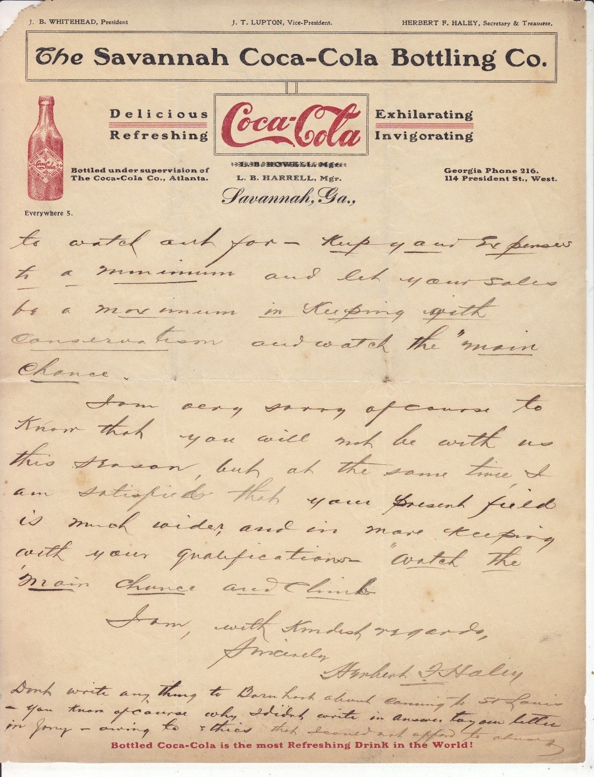 Title (ebay affiliate link): THE SAVANNAH COCA-COLA BOTTLING CO.. LETTERHEAD EARLY STRAIGHT SIDED BOTTLE