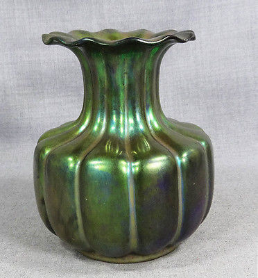 Title (ebay affiliate link): Deco Zsolnay Pecs Hungary Pottery Eosin Green Iridescent Fluted Segmented Vase