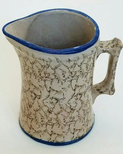 Antique 19c Tan/Brown Spongeware Blue Band Salt Glaze Stoneware Pitcher