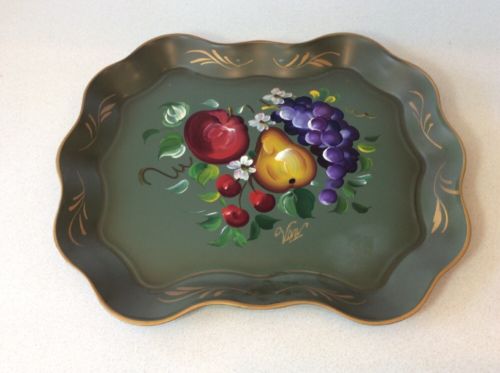 Title (ebay affiliate link): Nashco Products Vintage Blue Hand Painted Tole Toleware Tray Fruit 17"