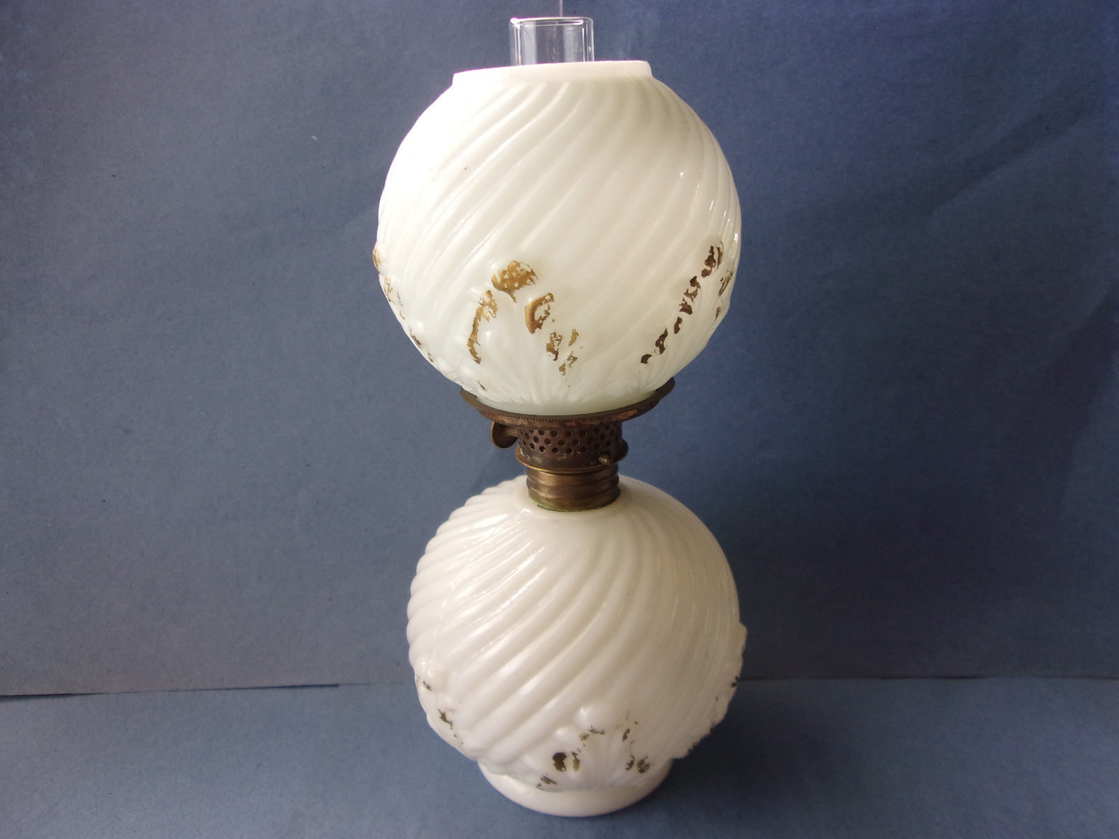 Title (ebay affiliate link): Antique Milk Glass Ribbed Swirl Design Mini OIL LAMP, Acanthus Leaf w/Gold