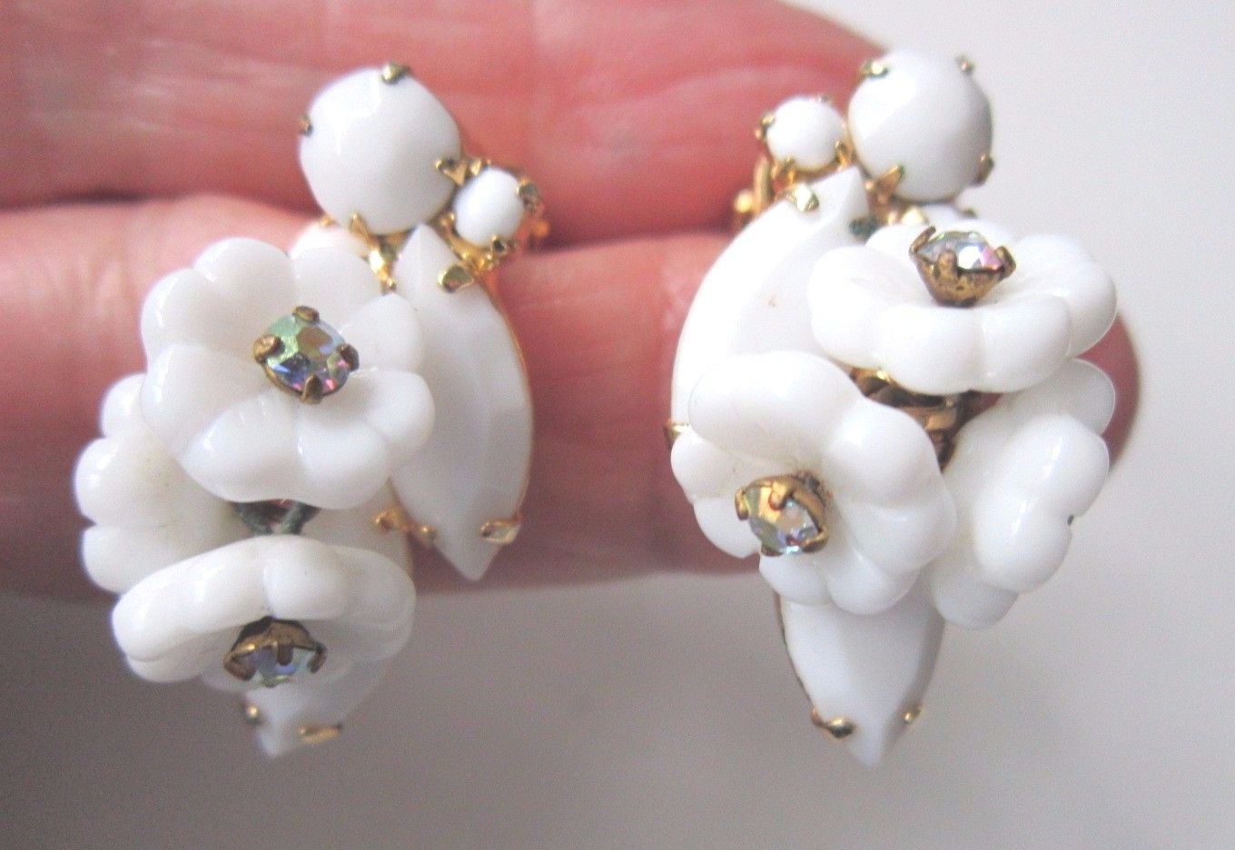 Title (ebay affiliate link): JULIANA CLIP EARRINGS-White Milk Glass Dangling Flowers W/AB Rhinestones-Vintage