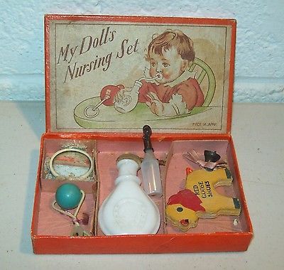 My Dolls Nursing Set Made In Japan Vintage Old Antique Milk Glass Baby Red Goose