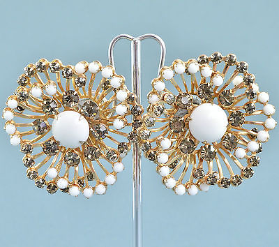 Vintage Earrings Large 1960s White Milk Glass & Grey Crystal Flowers Jewellery