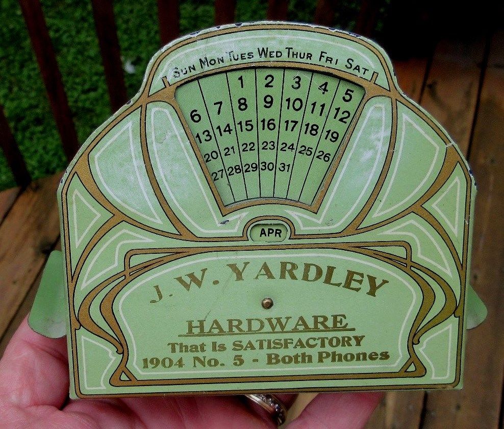 Title (ebay affiliate link): ANTIQUE 1904 J.W. YARDLEY HARDWARE Tin Litho Perpetual Desk Calendar & Pen Rest