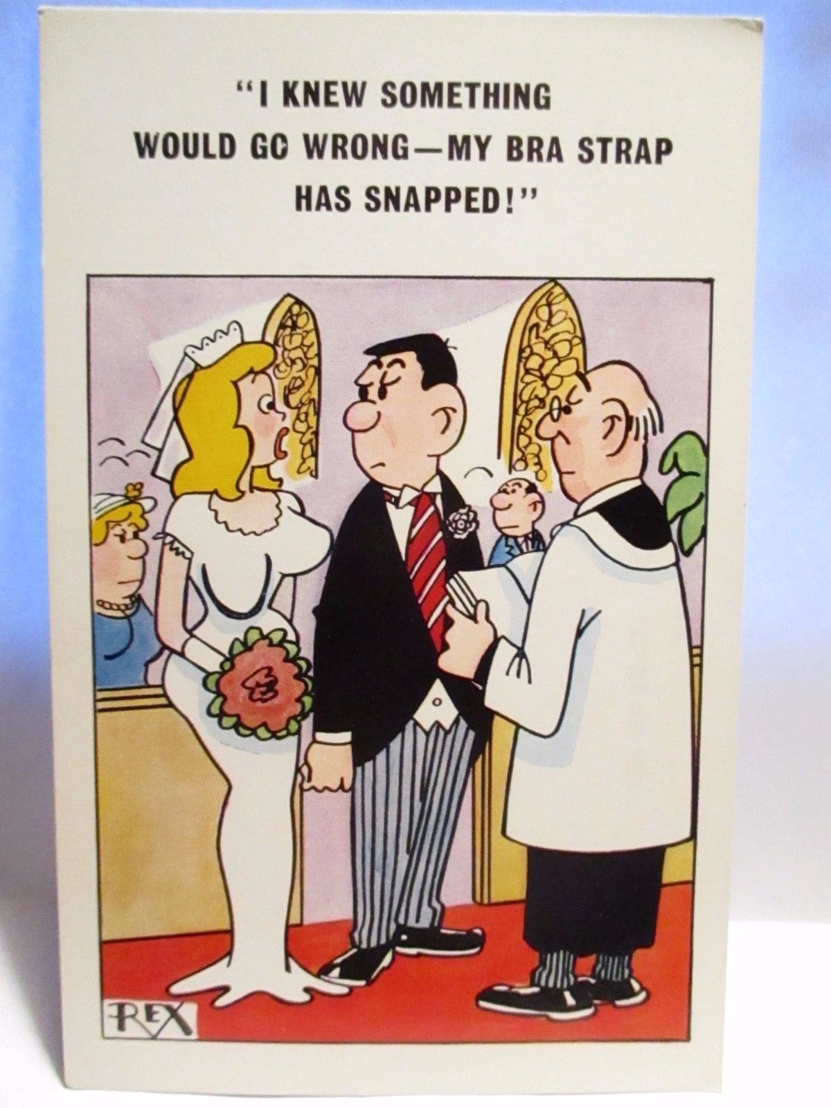 Title (ebay affiliate link): 1950s ART SIGN REX RISQUE POSTCARD MY BRA STRAP SNAPPED BIG BOOB BRIDE, WEDDING