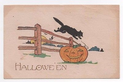 Title (ebay affiliate link): Jack O' Lantern Fence Black Cat Halloween Postcard Witch 1910s 1914
