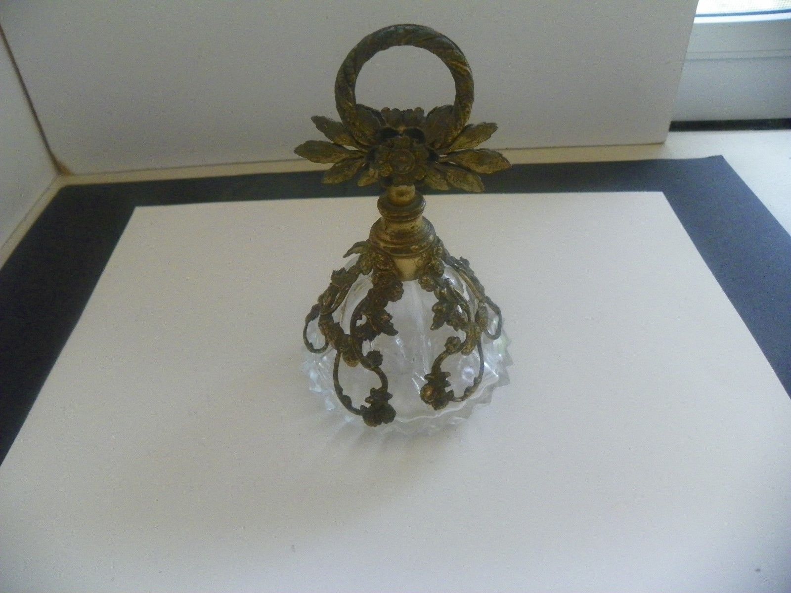 Title (ebay affiliate link): VTG ORNATE CRYSTAL PERFUME BOTTLE WITH ANTIQUE GOLD OVERLAY ROSES 1950/60's