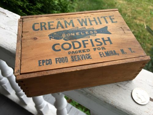 Title (ebay affiliate link): Antique Codfish Box Cobalt Blue Advertising Wooden Box Fish Graphics