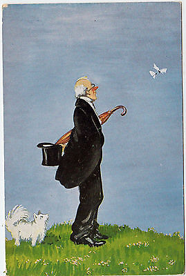 MAN WITH SMALL WHITE DOG - White Butterflies - c1920s era postcard