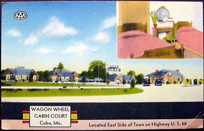Title (ebay affiliate link): CUBA, MISSOURI: Wagon Wheel Cabin Court, US Route 66 Roadside View ca1940
