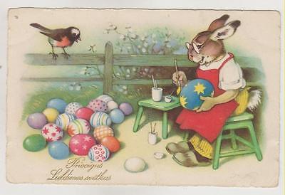 Dressed rabbit paint egg.Vintage German postcard.~1930