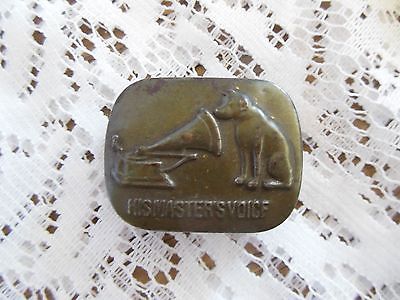 Title (ebay affiliate link): ANTIQUE VICTOR "IN HIS MASTER'S VOICE TIN, EMBOSSED, 1 1/2" X 1 1/4"