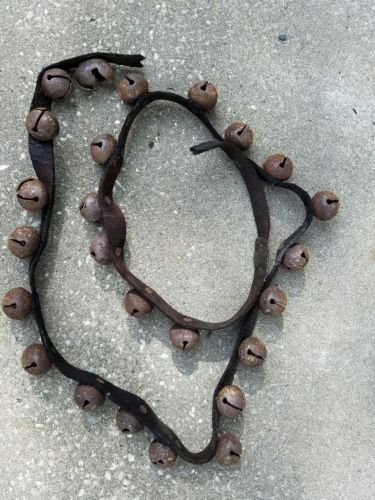 Title (ebay affiliate link): 23 ANTIQUE HORSE BRASS SLEIGH BELLS On Leather strap