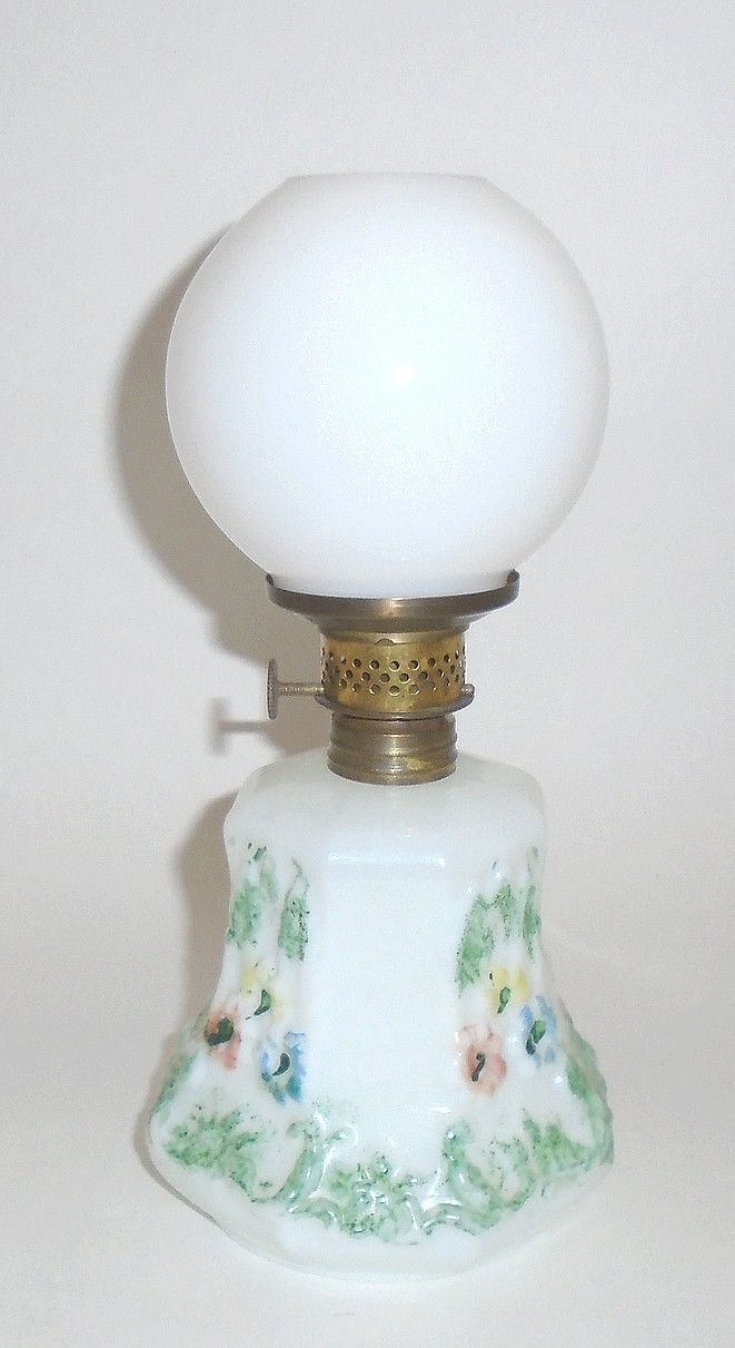Title (ebay affiliate link): Vintage Consolidated Milk Glass Miniature Oil Lamp Base with Hand Painted Detail