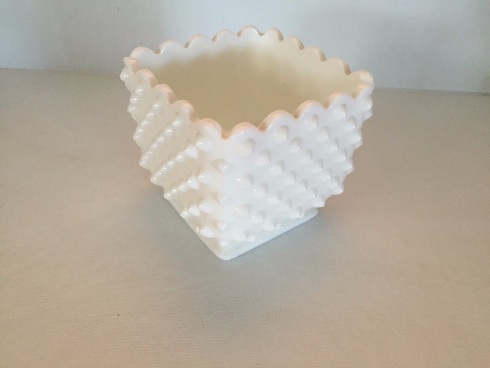 FENTON*Hobnail Square Planter*White Milk Glass*Dish*Vase