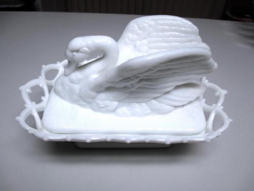 Title (ebay affiliate link): WESTMORELAND SWAN WHITE MILK GLASS WINGS SPREAD ON LACY EDGE BASKET