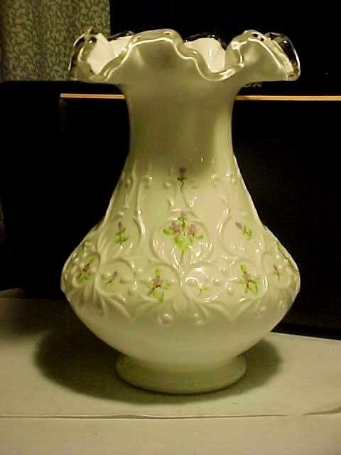 Title (ebay affiliate link): Vintage 7 3/4" Fenton Milk Glass Hand Ptd Violets In The Snow Spanish Lace Vase
