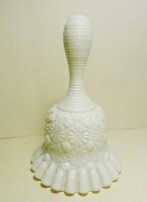 Title (ebay affiliate link): Fenton White Milkglass Daisy & Button Banded Handled Ruffled Bell-Vintage