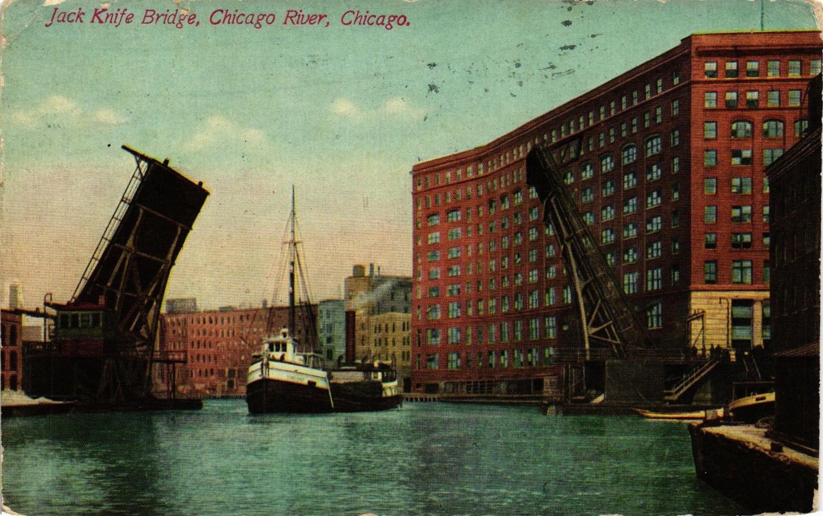 DR JIM STAMPS US JACK KNIFE BRIDGE & SHIPS POSTCARD CHICAGO 1910