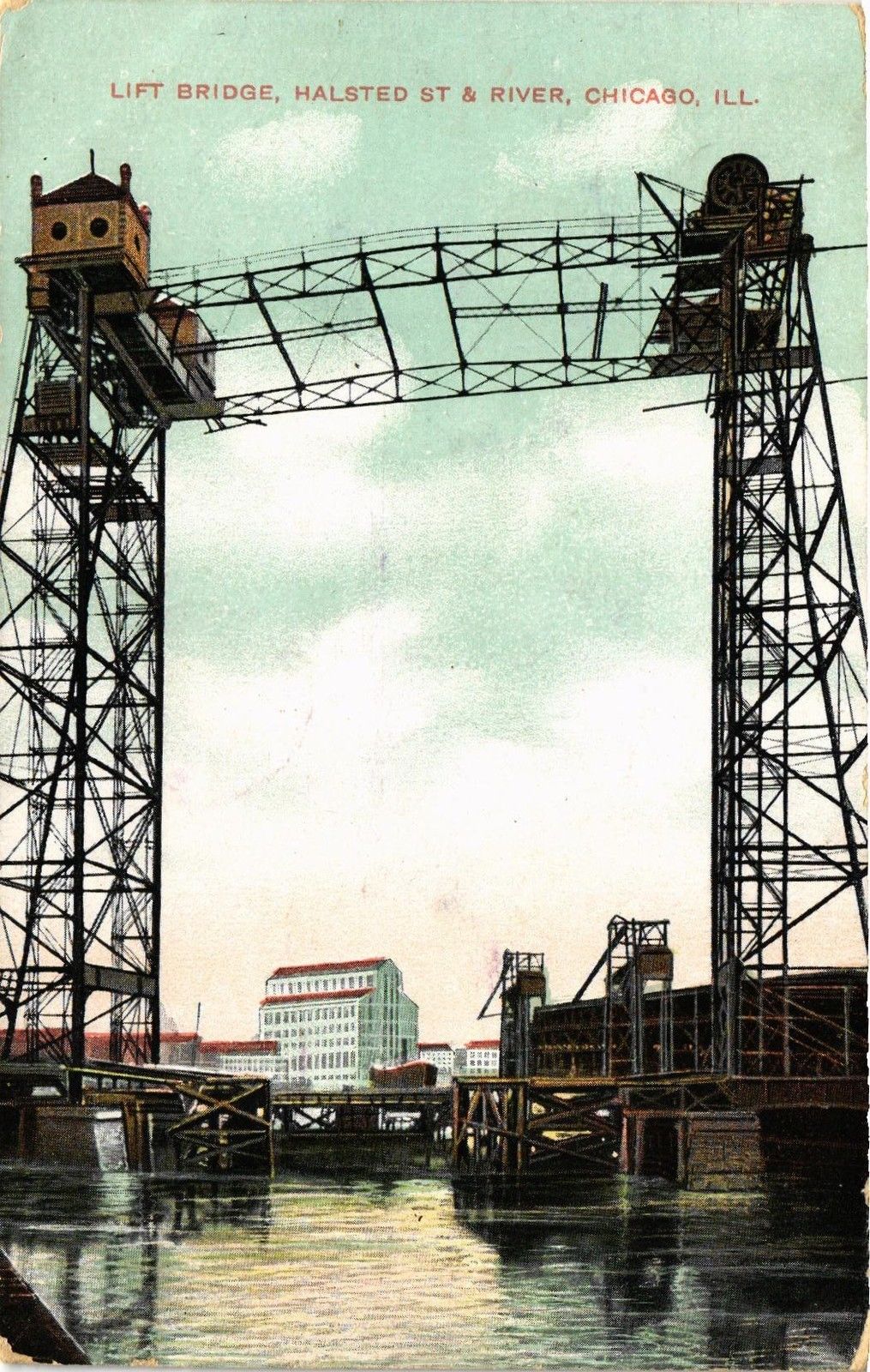 DR JIM STAMPS US LIFT BRIDGE HALSTED STREET CHICAGO RIVER POSTCARD 1908