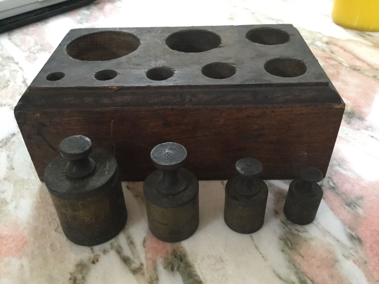 Title (ebay affiliate link): ANTIQUE Iron Balance Scale Weights OAK CONTAINER/BOX vintage