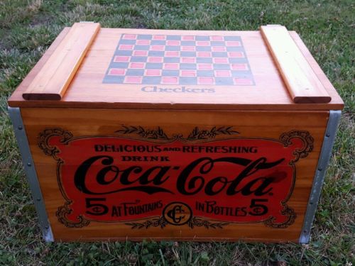 Title (ebay affiliate link): 1993 Coca-Cola Wooden Storage Toy Box Crate Checkers Board on Hinged Lid COKE