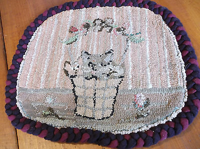 Antique Hooked Rug /Mat KITTENS IN A BASKET w/Braided Edge 16 1/2"x 14 1/2"
