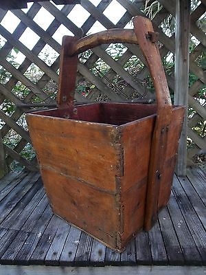 VINTAGE PRIMITIVE LARGE SQUARE HAND MADE WOOD BUCKET WOODEN HANDLE FARM CHIC
