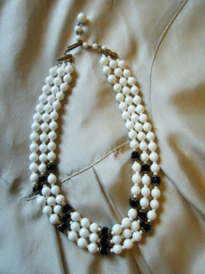 VINTAGE THREE STRAND WHITE & BLACK MILK GLASS NECKLACE