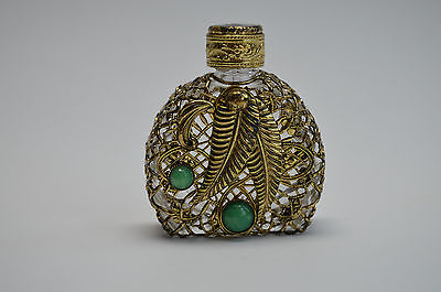 Vtg Czech flligree perfume bottle clear glass green stones glass dauber