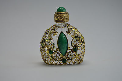 Vtg Czech filigree perfume bottle clear glass green stones , glass dauber
