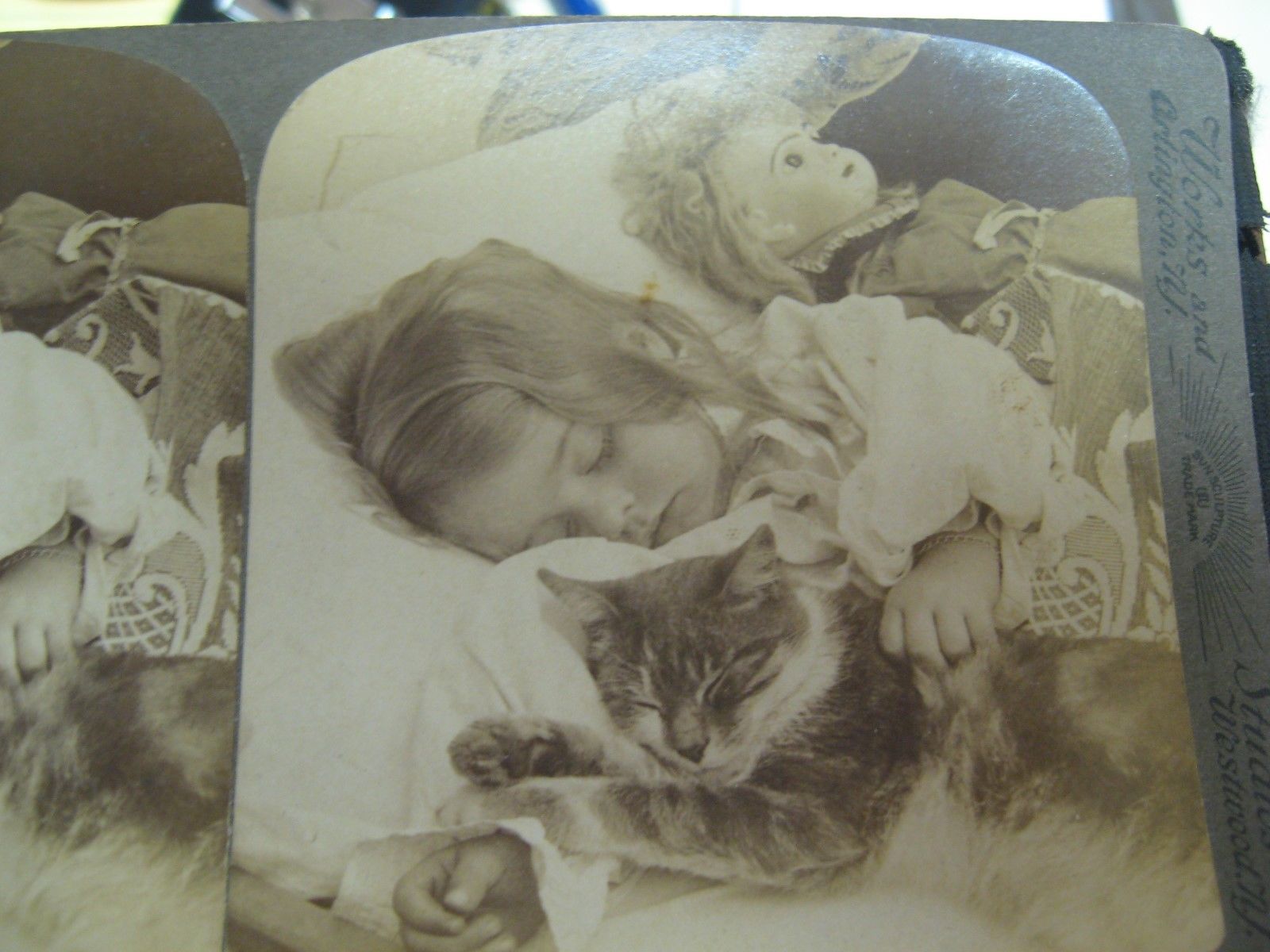 Title (ebay affiliate link): Antique Stereoscope Card Photo Child, Doll, Cat Sleeping "Sleepy Land"