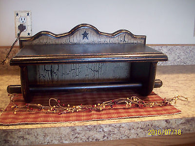 PRIMITIVE CRACKLE BLACK STAR WOOD PAPER TOWEL HOLDER WITH SHELF COUNTRY DECOR